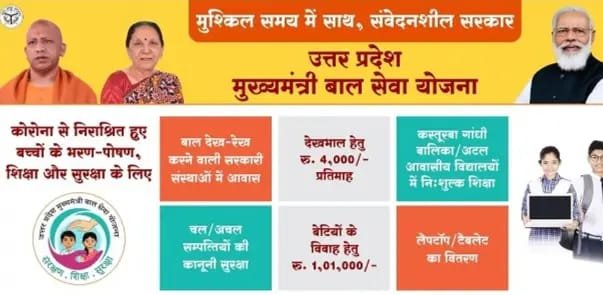 उoप्रo मुख्यमंत्री बाल सेवा योजना के अंतर्गत कोविड-19 महामारी के कारण अपने माता-पिता दोनों अथवा किसी एक को खोने वाले उ०प्र० के निवासी 18 वर्ष तक के बच्चों को ₹ 4,000/- प्रतिमाह के साथ-साथ 11 से 18 वर्ष तक की आयु के बच्चों की शिक्षा कक्षा 12 तक निःशुल्क प्रदान करने हेतु अटल आवासीय विद्यालयों तथा कस्तूरबा गांधी आवासीय विद्यालयों में प्रवेश दिया जाता है। साथ ही योजना की लाभार्थी बालिकाओं के विवाह योग्य होने पर विवाह हेतु रु0-1,01,000/-की राशि तथा कक्षा-9 या इससे ऊपर अथवा व्यवसायिक शिक्षा प्राप्त कर रहे 18 वर्ष की आयु तक के बच्चों को लैपटॉप की सुविधा प्रदान किया जाता है।
