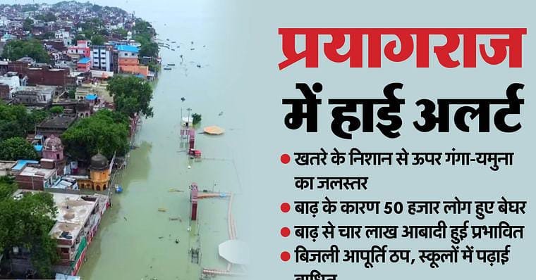 प्रयागराज में चेतावनी बिंदु को पार करने के बाद गंगा-यमुना का जलस्तर खतरे के निशान से कई मीटर ऊपर पहुंच गया है। प्रयागराज और कौशांबी में 250 से अधिक गांव और मोहल्ले बाढ़ की चपेट में आ गए हैं। इनमें ज्यादातर गांव-मोहल्ले प्रयागराज के हैं।