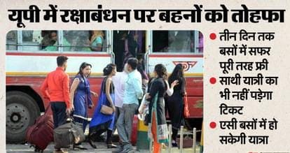 रक्षा बंधन के उपलक्ष्य में उत्तर प्रदेश परिवहन निगम की बसों में महिलाएं एक सहयात्री के साथ शुक्रवार की सुबह छह बजे से रविवार 10 अगस्त की रात 12 बजे तक एसी और नॉन एसी सभी तरह की बसों में नि:शुल्क यात्रा कर सकेंगी। इसको लेकर परिवहन निगम 986 बसों का संचालन करेगा और 50 बसों को रिजर्व रखेगा। बसों के बेहतर संचालन को लेकर चालकों और परिचालकों की छुट्टियां भी 12 अगस्त तक की निरस्त कर दी गईं हैं।