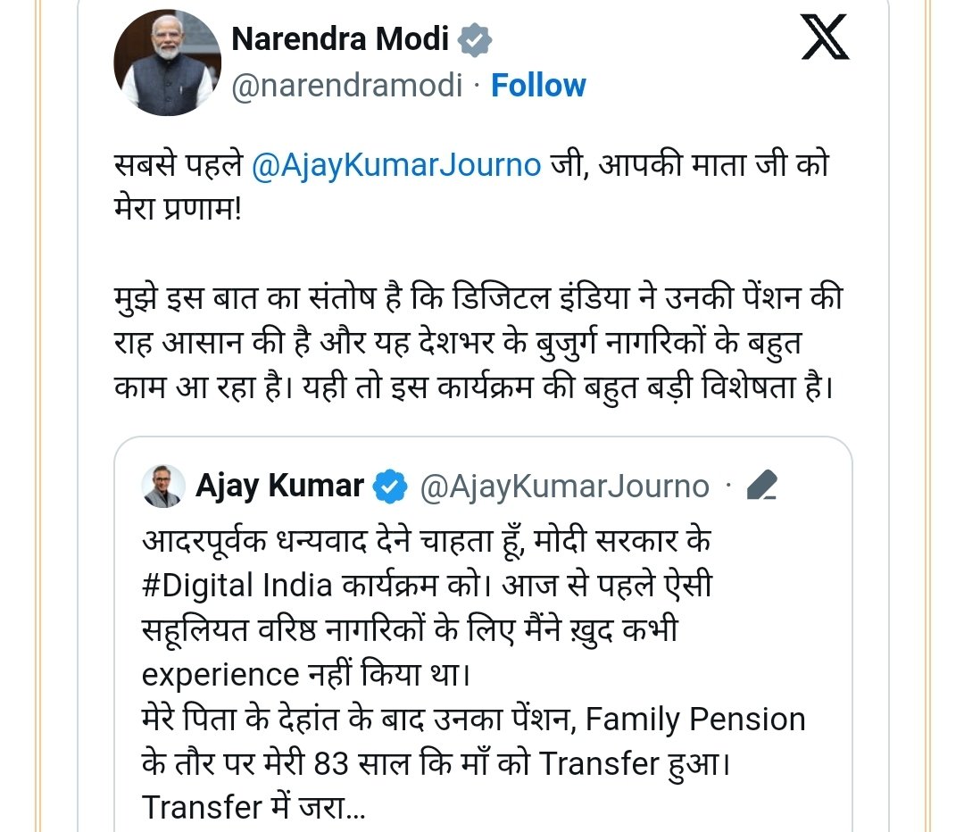 प्रधानमंत्री श्री नरेन्द्र मोदी ने आज इस बात पर संतोष व्यक्त किया कि डिजिटल इंडिया ने पेंशन पाने की प्रक्रिया को आसान बना दिया है और यह देश भर के वरिष्ठ नागरिकों के बहुत काम आ रहा है। पत्रकार अजय कुमार की एक पोस्ट पर प्रतिक्रिया व्यक्त करते हुए, श्री मोदी ने लिखाः “सबसे पहले @AjayKumarJourno जी, आपकी […]